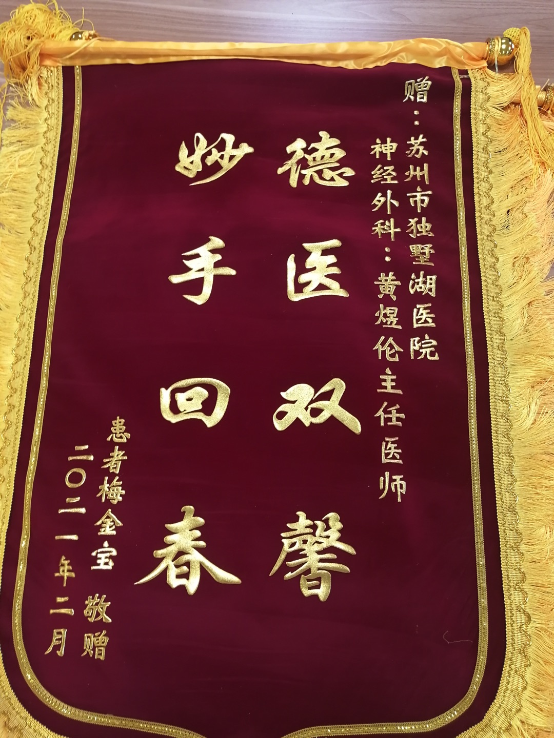 患者梅女士赠送锦旗感谢我院神经外科黄煜伦主任
