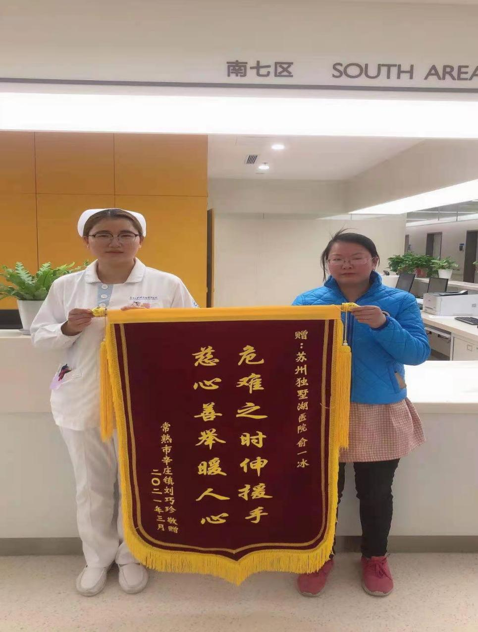 2021年3月29日上午,市民濮女士手捧印有“危难之时伸援手、慈心善举暖人心”的锦旗来到苏州市独墅湖医院肿瘤科。她向科室医务人员讲述了母亲被救的事情经过,讲到激动处,声音哽咽。见到肿瘤科护士俞一冰后,濮女士双眼含着泪花,紧紧握住俞护士的手,连声道谢:“谢谢您不顾一切救我妈。您用行动向我们诠释了什么是白衣天使,让我真切感受到人世间的美好和善意。”“我只是做了一件力所能及的事。”俞一冰坦言道。