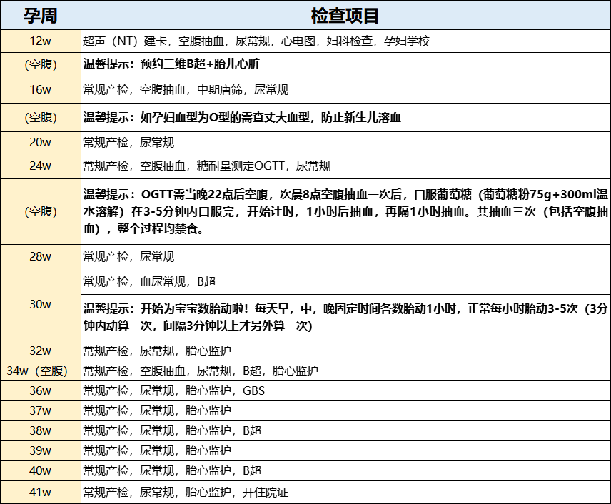 3.产检需要空腹时间:(1)12周建卡;(2)16周中期唐氏筛查;(3)24周OGTT;(4)34周肝功能等检查。