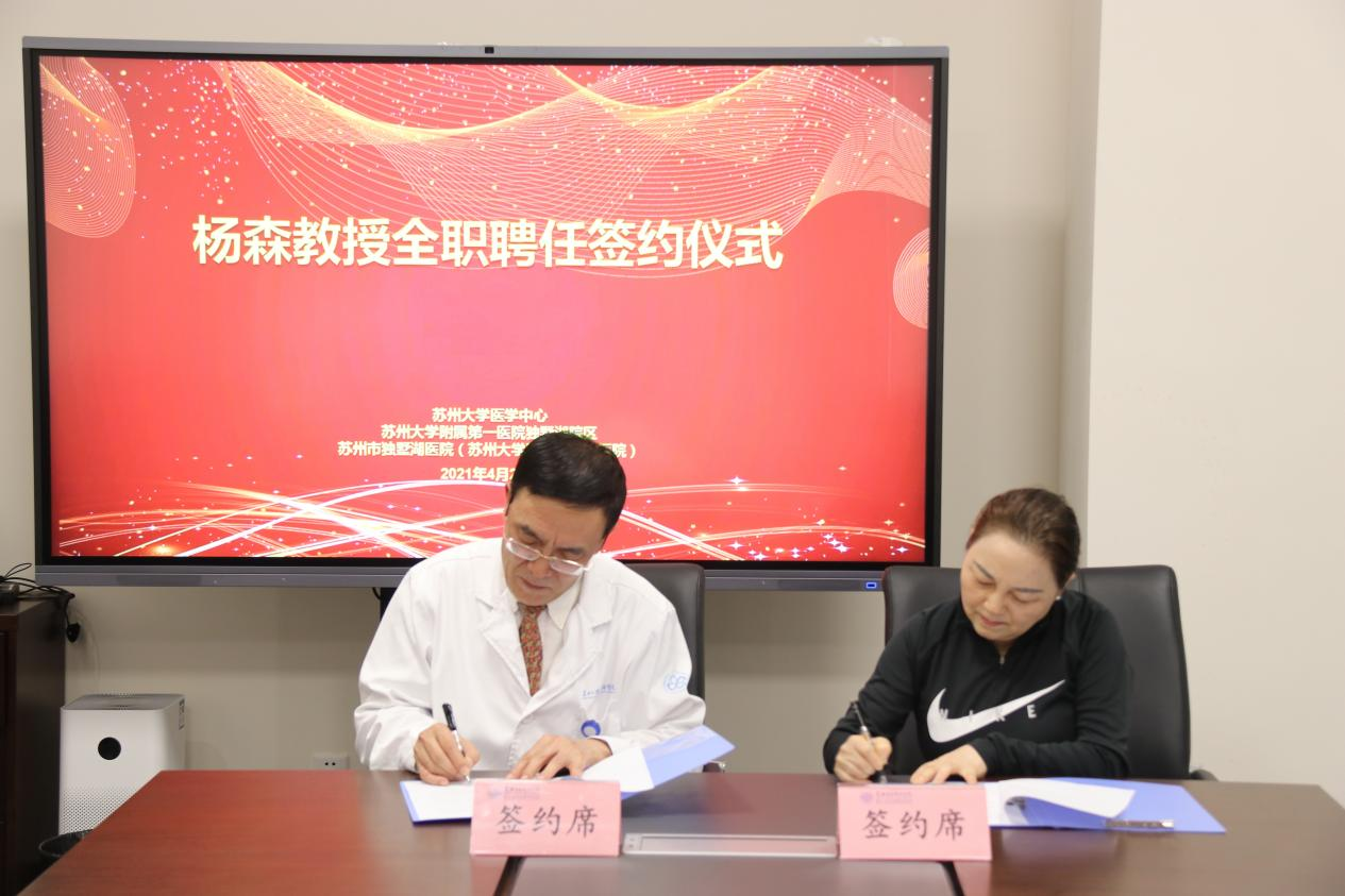 今天(423日)下午,苏州市独墅湖医院(苏州大学附属独墅湖医院)举行首席皮肤美容专家杨森教授全职聘任签约仪式党委书记、院长侯建全,党委副书记纪委书记洪建娣皮肤科全职聘任专家张学军、党政综合办主任傅强皮肤科主任李敏等出席仪式。