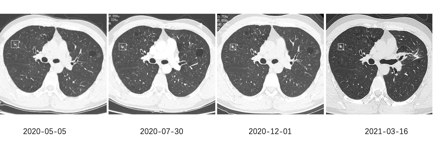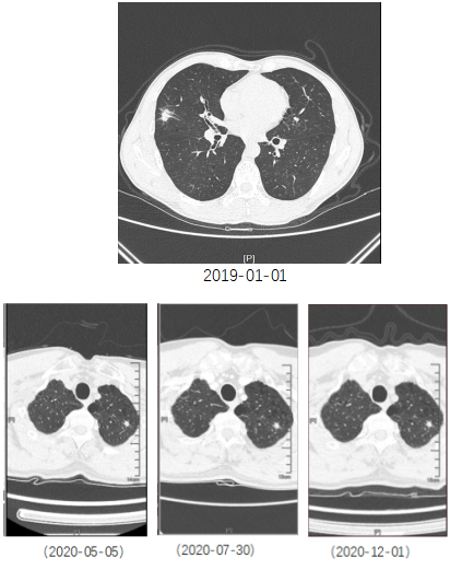 近日,我院呼吸与危重症医学科来了一个“老”病人。患者于2018年体检CT提示双肺多发结节、右肺中叶结节,大小约1.5*1.0cm,考虑恶性肿瘤的可能性大。去年,患者于全麻下行胸腔镜下肺肿瘤切除术(右),术后病理确诊为腺癌。经过4次化疗,并定期随访CT。去年5月份,从原先的6.89mm*5.3mm逐渐发展到了7.62mm*6.21mm。