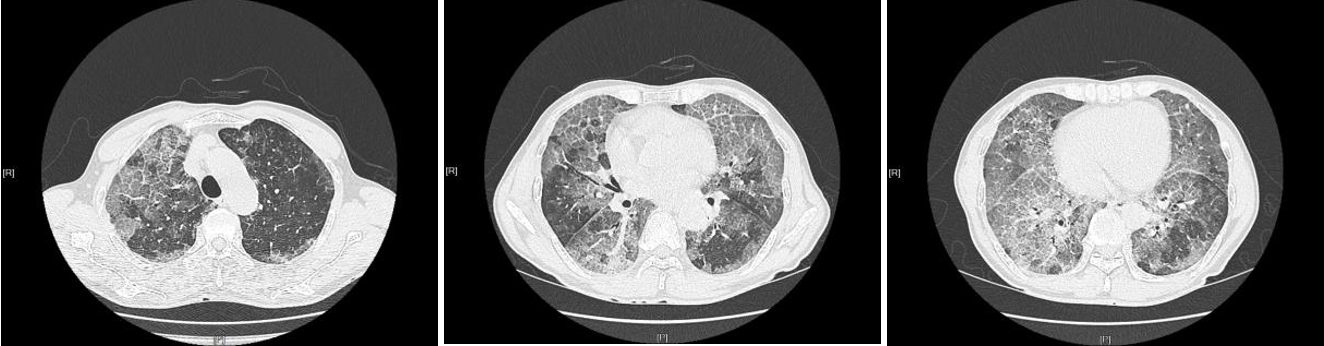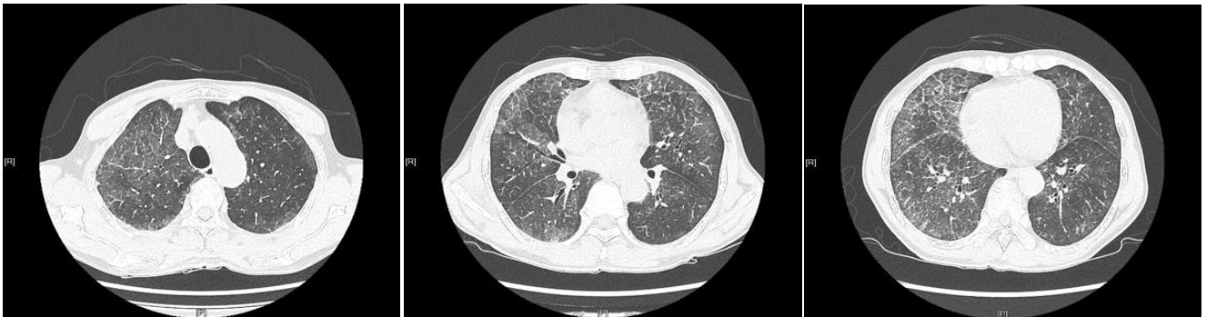 治疗前胸部CT:两肺多发磨玻璃阴影,典型的铺路石症