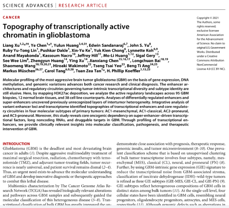 4月30日,苏州大学医学中心(苏州大学附属独墅湖医院)黄煜伦教授作为共同第一作者与新加坡国立大学徐良教授等研究人员联手在国际著名期刊Science Advance杂志在线发表题为“Topography of transcriptionally active chromatin in glioblastoma”的研究论文。该论文主要解释表观遗传调控在胶质母细胞瘤产生和发展中的作用,揭示GBM中超级增强因子所驱动的转录因子、长链非编码RNA以及可能的药物靶点等所发挥的核心致癌作用,为临床上基于超级增强子对GBM进行分子分类、指导临床治疗提供依据。(Science Advance是国际著名杂志SCIENCE 的子刊,2020年影响因子13.11)