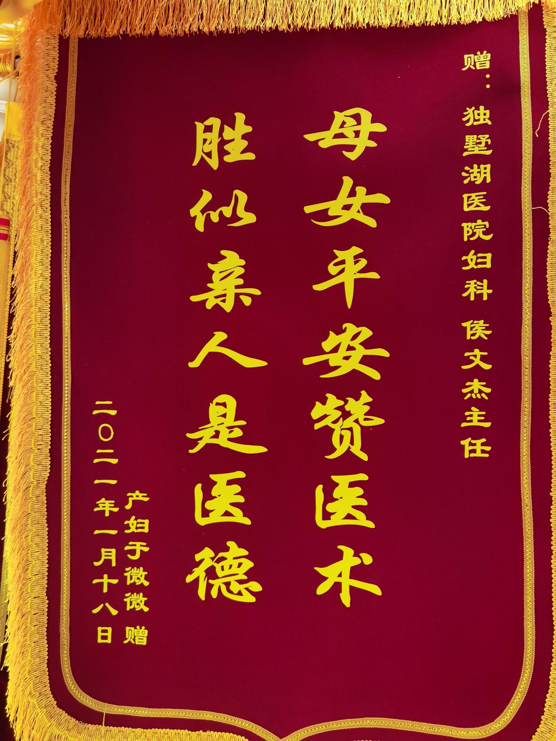 产妇于女士赠送锦旗感谢我院妇产科侯文杰主任