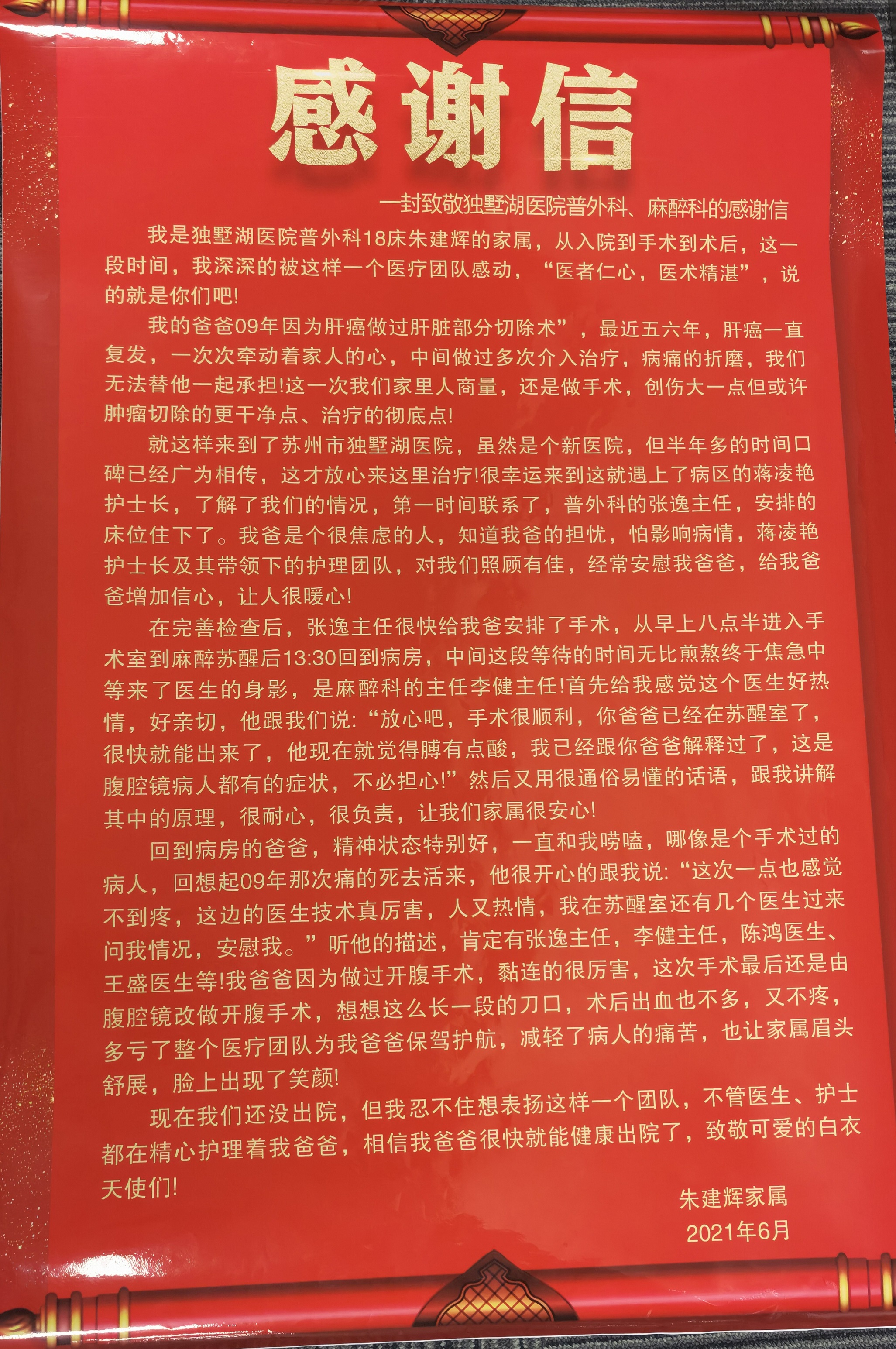 一封致敬独墅湖医院普外科、麻醉科的感谢信