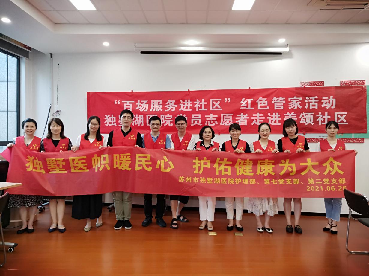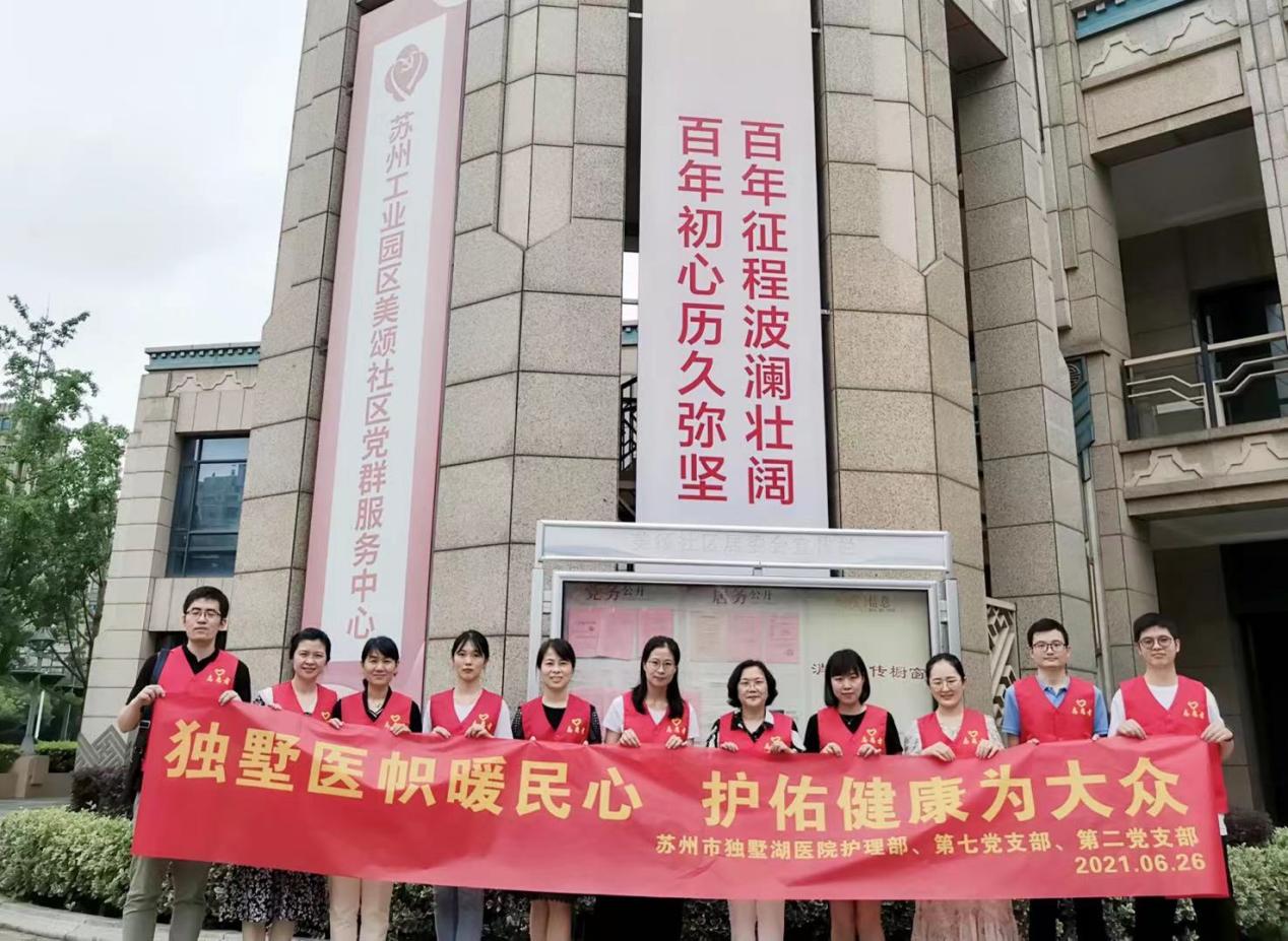 百年征程,初心弥坚。为向党的百年华诞献礼,提高广大人民群众的健康意识,6月26日,在苏州市独墅湖医院(苏州大学附属独墅湖医院)护理部王洁主任的组织下,医院护理部、第七党支部、第二党支部开展了一场以“独墅医帜暖民心,护佑健康为大众”为主题的义诊活动,充分发挥了党员先锋模范作用,在居民中得到了良好的反响和支持。