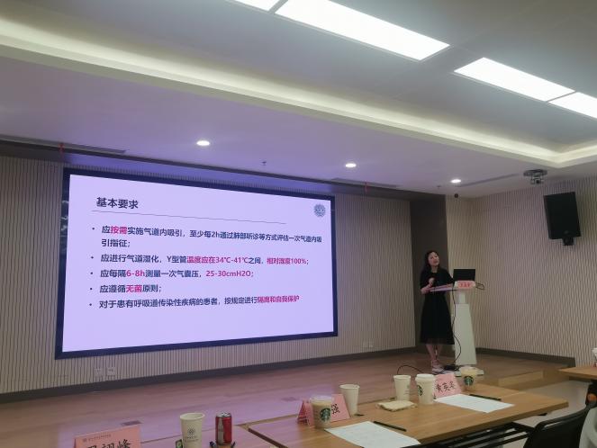 王玉宇护士长就人工气道的管理做了详细介绍。她从气道内吸引以及气道湿化两方面展开演讲,阐述了按时吸痰和按需吸痰的区别,以及怎样在临床做好按需吸痰。她表示,在危重症科室,人工气道的管理是基础且重要的一项工作,必须认真执行。