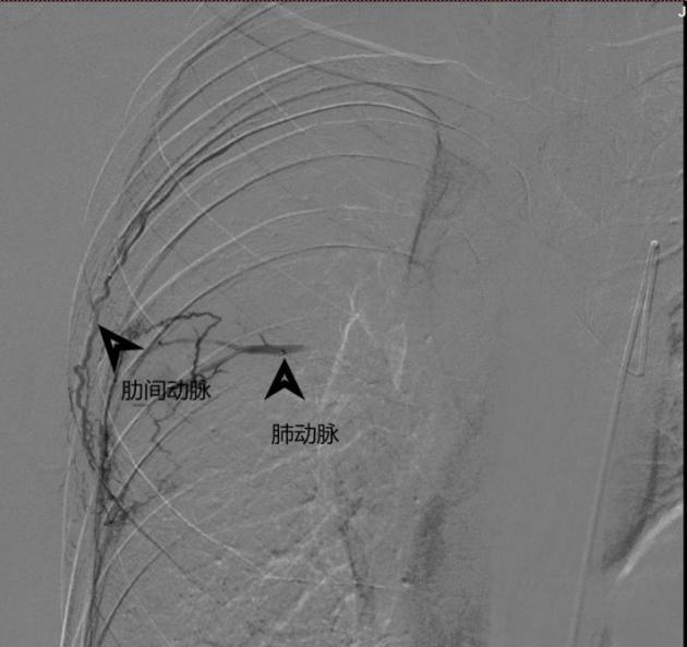 近日,在介入与血管外科张喜成主任医师指导下,程龙副主任医师及顾铖涛医师在DSA下造影找到了病变出血的原因——原来患者存在肋间动脉、支气管动脉肺动脉瘘。于是决定为患者行选择性动脉栓塞术。术中,如下图所示,医生用头发丝样的微导管超选择供血血管,尽可能避开对正常血管的影响后,用栓塞微球将瘘口堵塞住进行精准栓塞,整个手术约1个小时,术后复查咯血症状消失。在医护人员的精心照料下,术后10天,患者顺利康复出院。