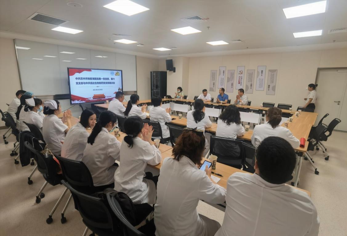 6月28日,苏州市独墅湖医院(苏州大学附属独墅湖医院)第一党支部与第六党支部与工业园区生物制药的龙头企业——信达生物制药党支部开展了党建座谈会。会议由苏州市独墅湖医院第一党支部书记陈文主持。