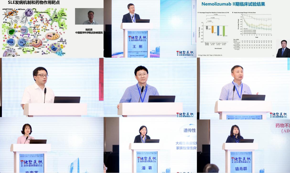中华医学会皮肤性病学分会主任委员陆前进教授、中国医师协会皮肤科医师分会会长王刚教授、中华医学会皮肤性病学分会第13届主任委员张建中教授、中南大学副校长陈翔教授、中国医疗保健国际交流促进会皮肤科分会主任委员晋红中教授、中国医师协会皮肤科医师分会副会长顾恒教授、空军军医大学西京皮肤医院副院长李春英教授、上海交通大学医学院附属瑞金医院皮肤科科主任潘萌教授、复旦大学附属华山医院变态反应科主任骆肖群教授分别围绕系统性红斑狼疮、银屑病、特应性皮炎、黑色素瘤、罕见病、慢性荨麻疹、白癜风、大疱性疾病、药疹等疑难重症皮肤病的新兴靶向药物的基础研究和临床应用,进行了全面的阐释,多角度、多方向地为大家带来了国内外皮最新进展动态,分享介绍了最新临床诊疗进展。