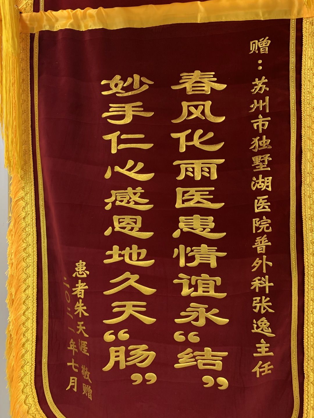 患者朱先生赠送锦旗感谢我院普外科张逸副主任医师