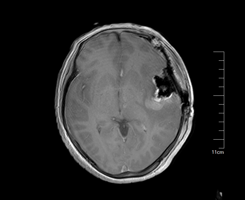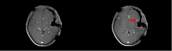 术中MRI提示瘤腔前内侧(额叶)残留肿瘤组织