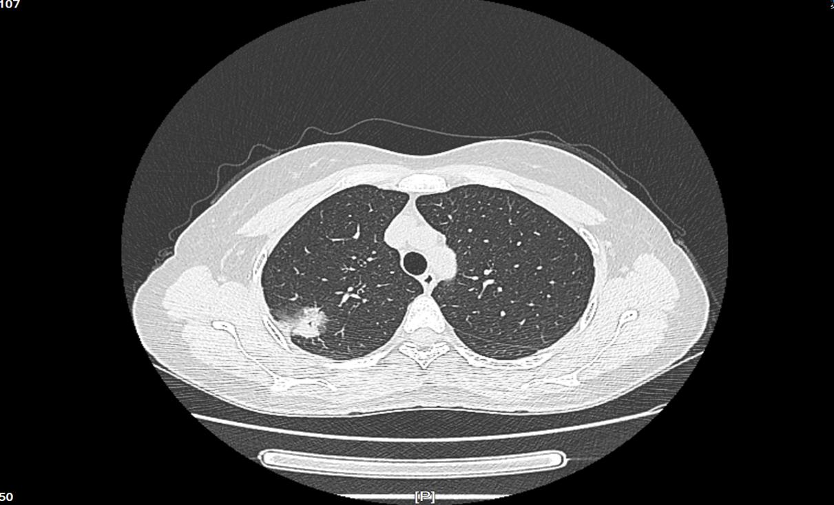 43岁的张女士,每年参加公司常规体检,包括胸部X光摄片等项目,均无任何异常。今年,张女士至我院健康管理中心进行年度体检,其中包括查胸部高分辨平扫CT这一检查项目。7月7日,张女士的胸部CT报告为:右肺上叶尖段见一团块状磨玻璃实性混合密度结节,边缘不光整,大小约22mm*25mm,考虑为早期肺癌可能。
