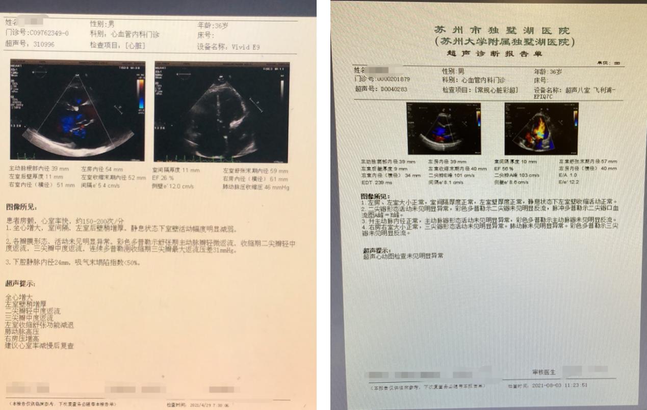 (左图:术前心脏彩超、右图:术后3个月心脏彩超)