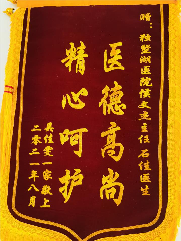 患者吴女士一家赠送锦旗感谢我院妇产科侯文杰副主任医师、石佳医生