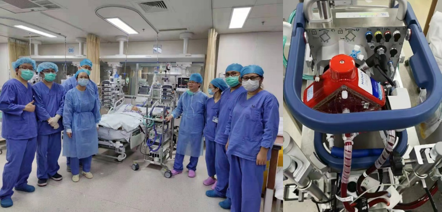 患者是一名67岁的阿婆,因上呼吸道感染后“重症爆发性心肌炎”突发呼吸困难8小时入我院急诊就诊。入院时患者已意识模糊,存在心力衰竭、呼吸衰竭等情况,突发室颤、心跳骤停,急诊医护人员紧急行心肺复苏、电除颤治疗,后行气管插管、呼吸机辅助通气。但此时床边心超显示患者左心功能极度微弱,再次出现室颤发作、心跳呼吸骤停,患者命悬一线,郭强副院长查看病人后非常重视,立即开展多学科会诊,最终确定治疗方案——尽快开展ECMO治疗,给患者带来一线希望。即刻与家属沟通病情,随后,带领团队在床旁超声引导下完成V-A模式 Cardiohelp-ECMO置管,成功转机后患者心脏负担明显减轻,但左室心肌收缩能力微弱,生命仍然危在旦夕,在我院急诊监护室进行24小时严密的监护及治疗,随时根据患者病情变化进行调整。