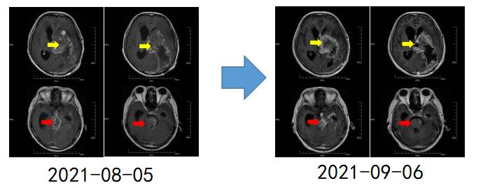 患者乙,2019年2月诊断为胶质母细胞瘤复发,WHO IV级,多家医院拒绝为其手术,7月远赴德国治疗。一年后,多肿瘤再次复发。于今年6月在外院行脑肿瘤切除术,术后病理提示复发胶质母细胞瘤,患者为求进一步诊治来我院就诊。经过我院胶质瘤多学科专家会诊后考虑患者为胶质母细胞瘤晚期,结合患者一般情况,放射治疗条件不允许,遂建议患者予以CAR-T细胞回输,回输后患者症状明显改善,目前在我院持续治疗中。