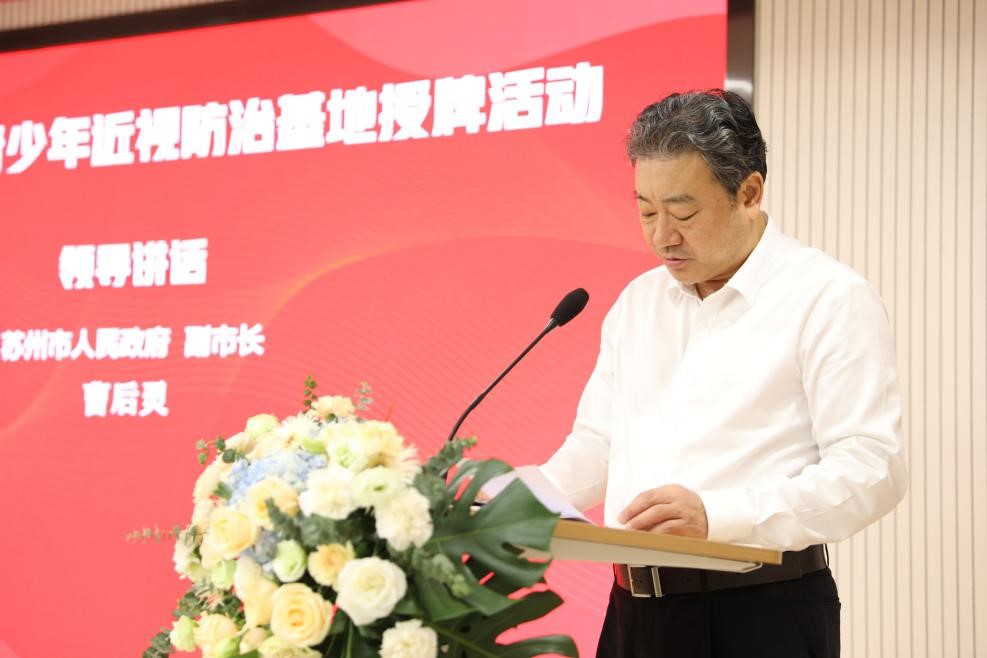 曹后灵副市长在活动中致辞。他强调,儿童青少年近视防治是一项长期的任务,要扎实、持续推进基地高标准遴选,高水平建设,高标准考核,真正发挥基地作用,共同当好儿童青少年眼健康守门人。一是在思想上要高度重视,近视防治需要全社会的共同努力。政府、学校、家庭、个人要担负起健康的责任,各地、各部门要强化组织领导、加大保障力度,共同构筑保障体系。二是在落实上要合理推进。要制定工作方案,各部门齐抓共管,确保2030年,全市儿童青少年总体近视率力争每年降低0.5个百分点以上、新发近视率明显下降。三是要在工作中依靠科学。全市各板块都要参照常熟市和工业园区,全面开展儿童青少年近视监测和干预工作。强化校医培训,提高校医队伍近视防控技术水平。各近视防治基地要充分发挥专业技术优势,全力提升我市儿童青少年近视防治水平。四是宣传上要全面覆盖。各地要充分发挥广播电视、报刊、网络、新媒体等作用,利用公益广告等形式,将近视防控科普知识普及到每一个家庭、每一个孩子。