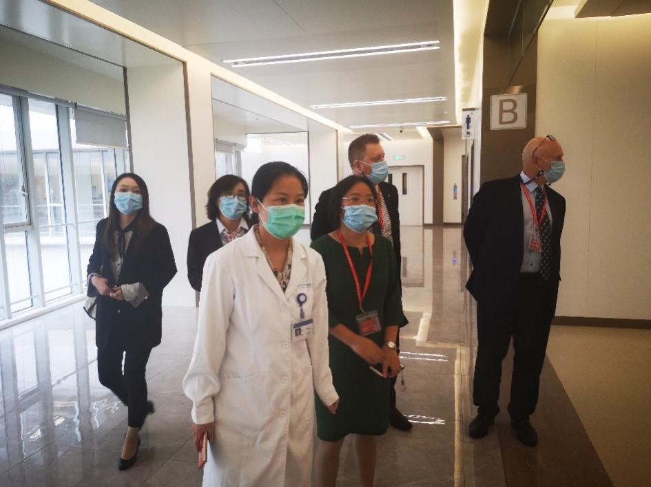 10月13日下午,苏州德威外籍人员子女学校校长Mike O'Connor、行政校长Alan Williams等一行六人来到我院,就开展国际诊疗服务合作进行调研。我院党委副书记、财务总监郭秀娟及财务处相关人员全程陪同参观了临床检测中心、高级诊疗中心、一体化家庭产房(LDR)、全科医学科和急诊。