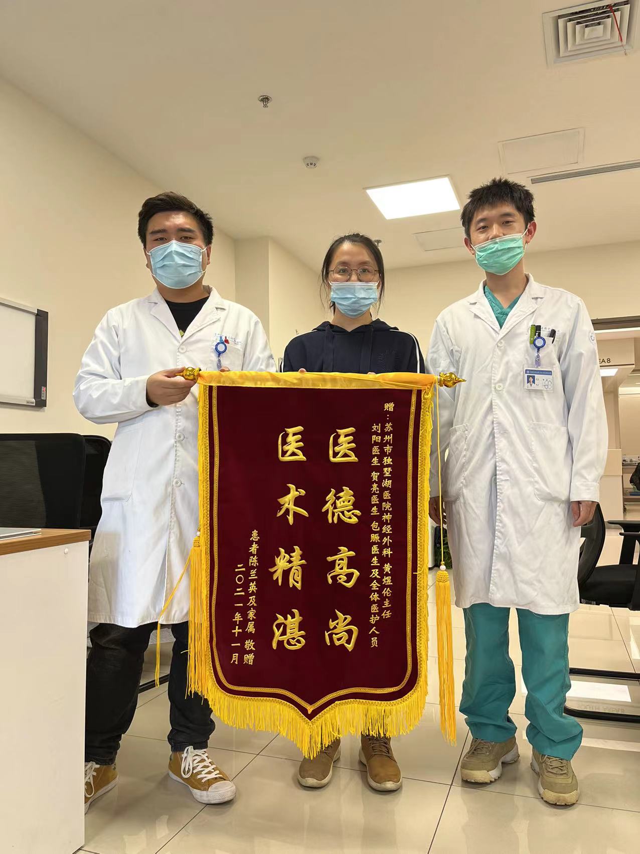 患者陈女士及家属赠送锦旗感谢我院神经外科黄煜伦主任、刘阳医生、贺亮医生、包赈医生及全体医护人员