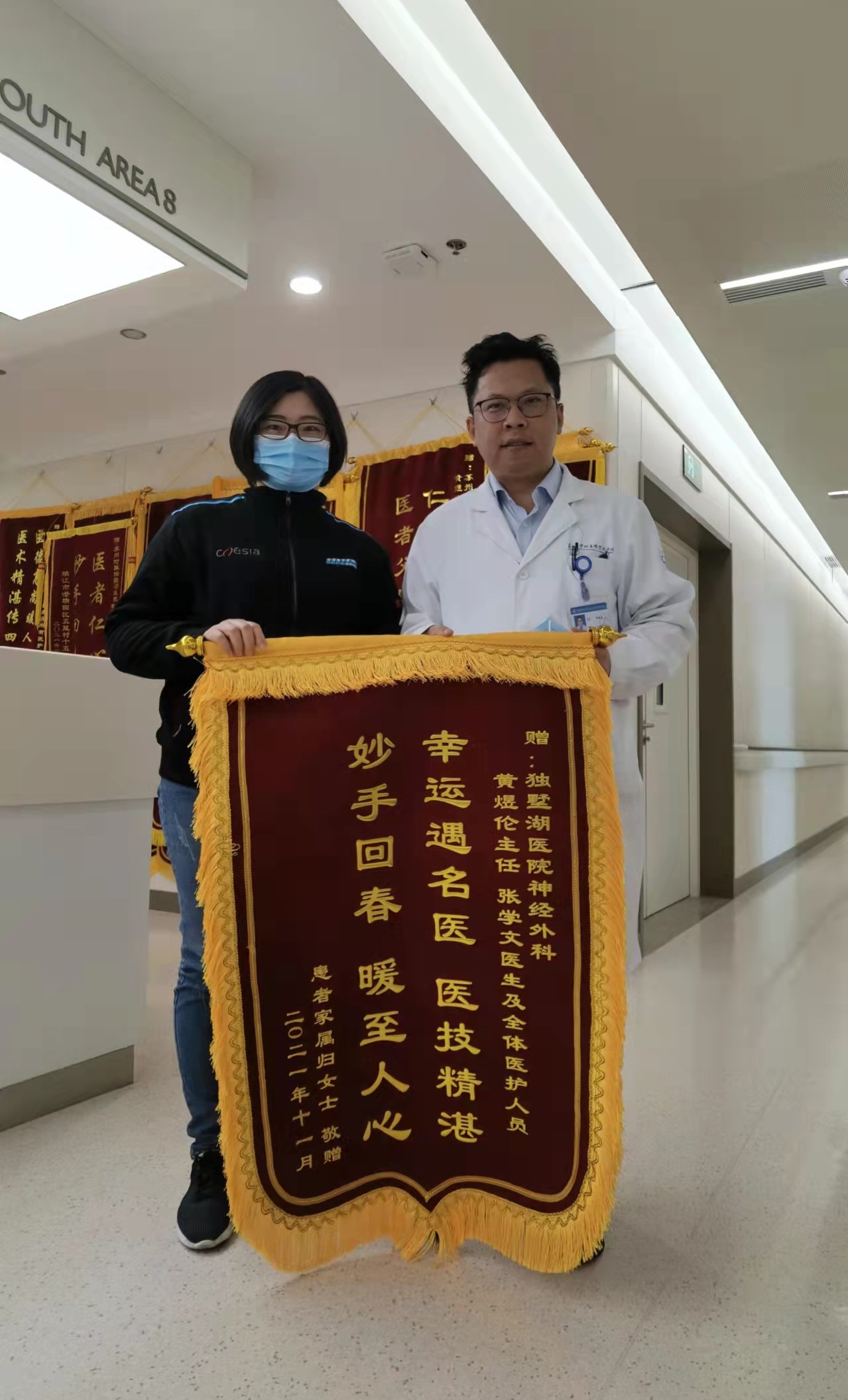 患者家属归女士赠送锦旗感谢我院神经外科黄煜伦主任、张学文医生及全体医护人员
