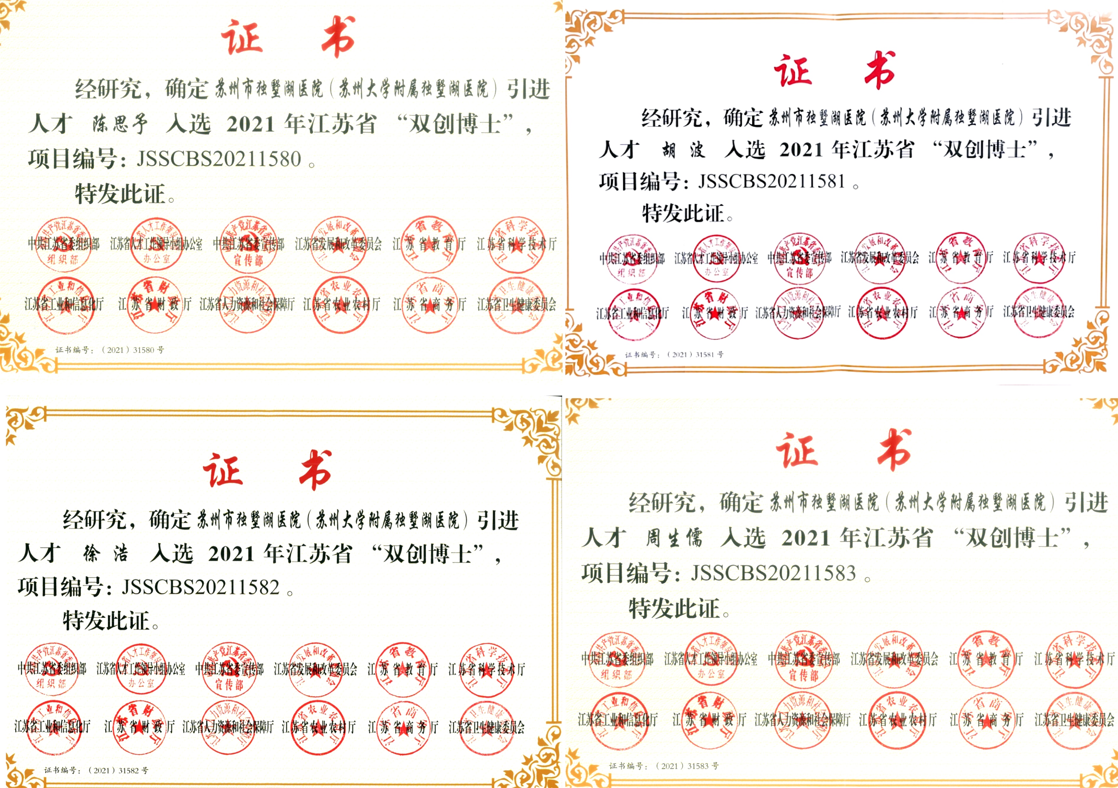 2021年我院陈思予、胡波、徐浩、周生儒4位博士成功入选2021年江苏省“双创计划”双创博士(世界名校类)项目培养对象,此次项目申报是我院启用以来首次正式申报人才工程,实现了该项目“零”的突破!
