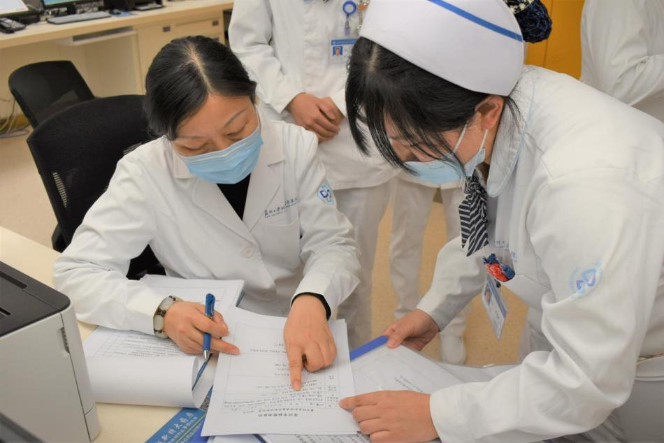 在现场4位专家围绕临床综合能力考核要求,从病情观察评估能力、专业的临床护理与应变处理能力、规范的动手能力、表达沟通能力、临床思维能力、人文关怀及素养等方面,对床位护士、床位组长、护士长进行了相关病例的成组考核;并检查了科室的质控及持续质量改进,转入交接单,护理管理等方面的相关台账;医院疫情防控工作的落实情况。最后查阅了护理部对全院护士培训考核、专科监测指标落实方案、疫情防控应急演练等台账。