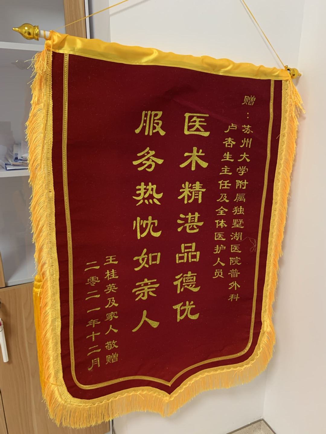 患者王女士及家属赠送锦旗感谢我院普外科卢杏生主任医师及全体医护人员