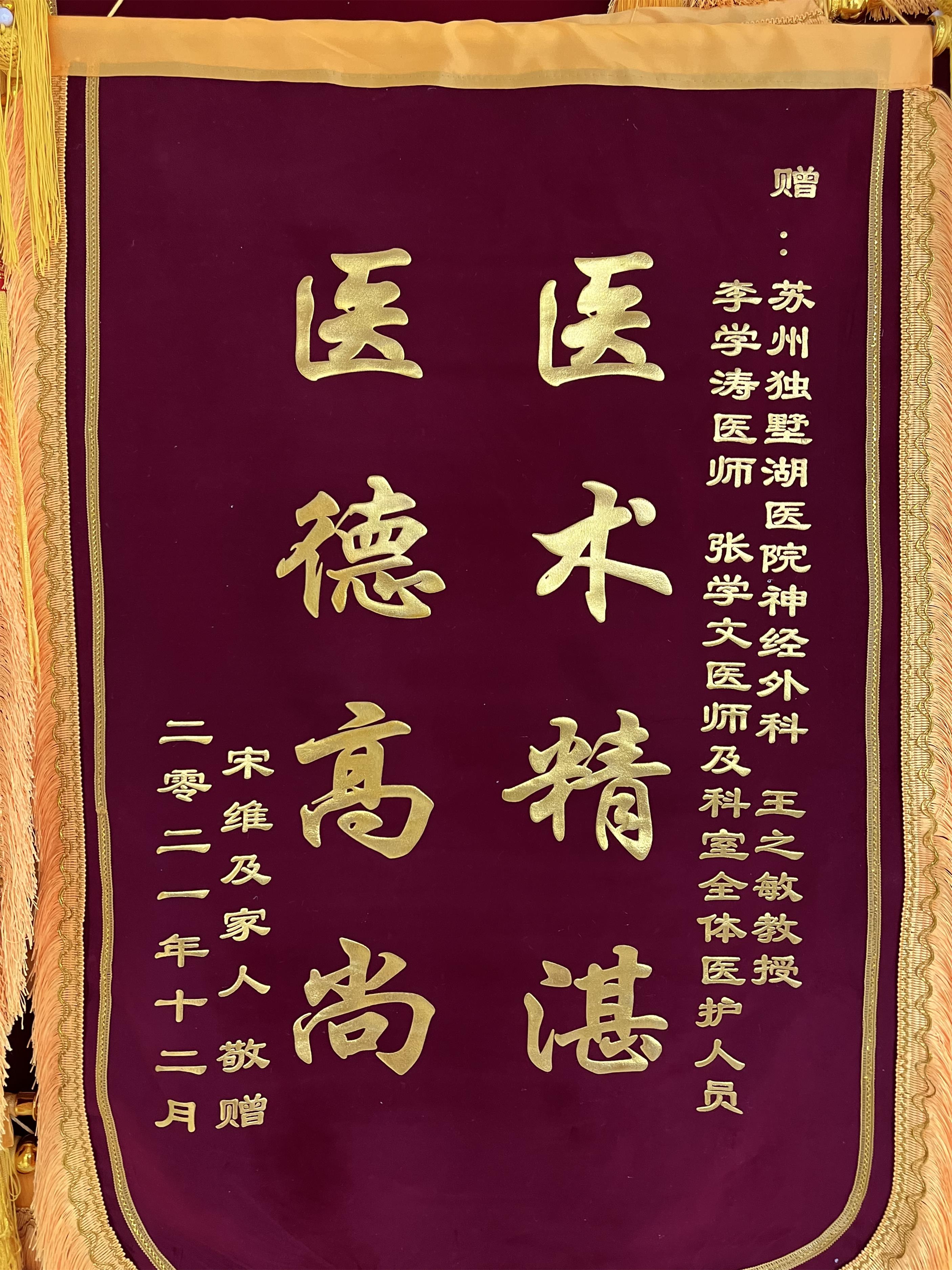 患者宋维及家人赠送锦旗感谢我院神经外科王之敏教授、李学涛医师、张学文医师及科室全体医护人员