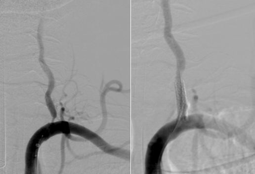 由于患者错过了4.5小时脑卒中静脉溶栓救治时间,无法溶栓治疗。郝永岗副主任带领神经血管介入团队评估病情后决定在全麻下为患者实施动脉取栓术,挽救处在缺血状态尚未坏死的脑组织。麻醉科李健主任第一时间到达导管室,保障手术顺利进行,术中可见患者基底动脉末端闭塞(基底动脉尖综合征)。医生运用SWIM技术取出黑红色血栓,复查造影显示:基底动脉远端血流通畅,双侧大脑后动脉、小脑上动脉显影。术中发现患者左侧椎动脉起始部重度狭窄,于病变处植入支架一枚,血管狭窄解除,术后送重症医学科继续治疗。
