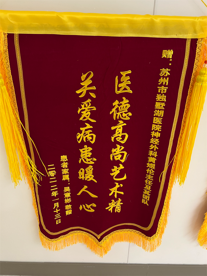 患者吴先生赠送锦旗感谢我院神经外科黄煜伦主任及其团队