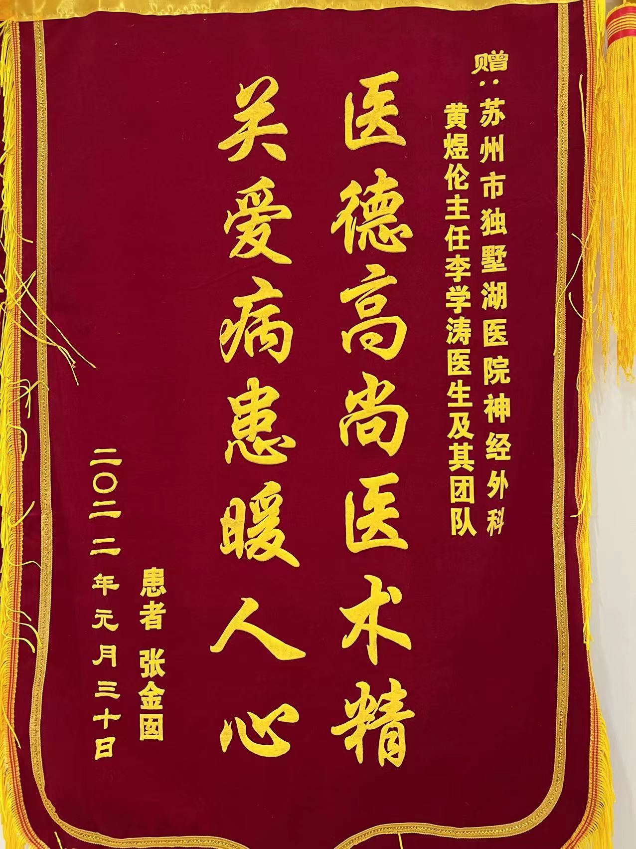 患者张女士赠送锦旗感谢我院神经外科黄煜伦主任、李学涛医生及其团队