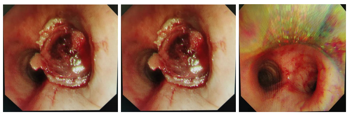 次日,吴先生已在手术室内完成全麻。术中,呼吸科、麻醉科和手术室医护互相配合,在硬镜下为病人进行气道内探查。硬镜下可见气管下段的新生物堵塞约90%的管腔,而右主支气管管腔已被完全堵塞。蒋主任团队在气管镜下对新生物进行圈套、切除,术中仅有少量出血,共取出3块新生物组织送病理检查,术后再次探查见气管、右主支气管管腔已恢复通畅。