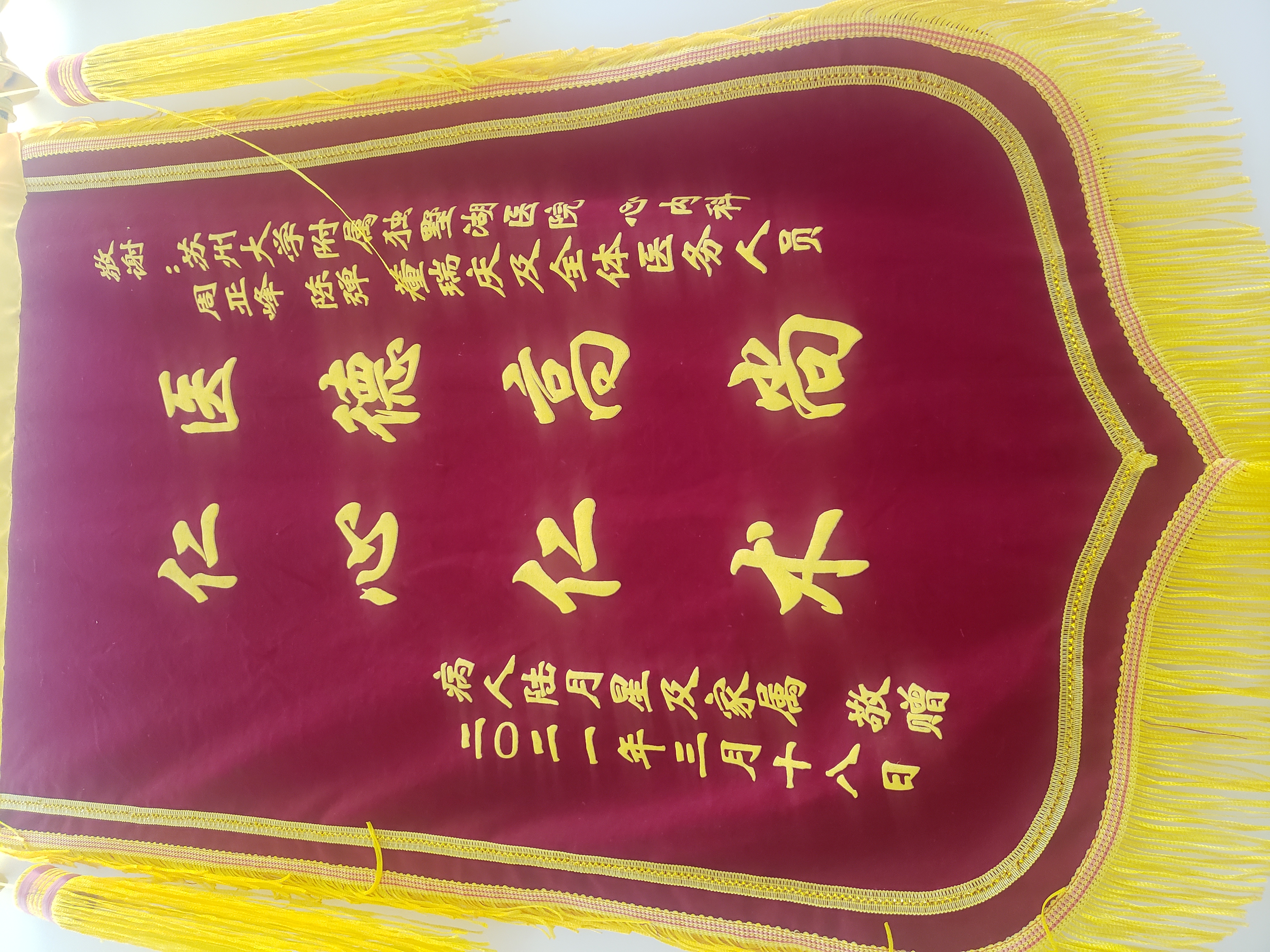 患者陆女士赠送锦旗感谢我院周亚峰副院长、心血管内科陈弹主任医师、董瑞庆医生及全体医护