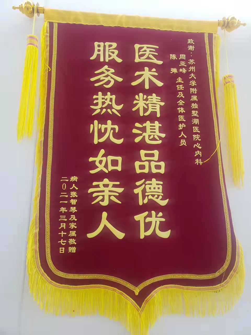 患者张女士赠送锦旗感谢我院周亚峰副院长、心血管内科陈弹主任医师及全体医护