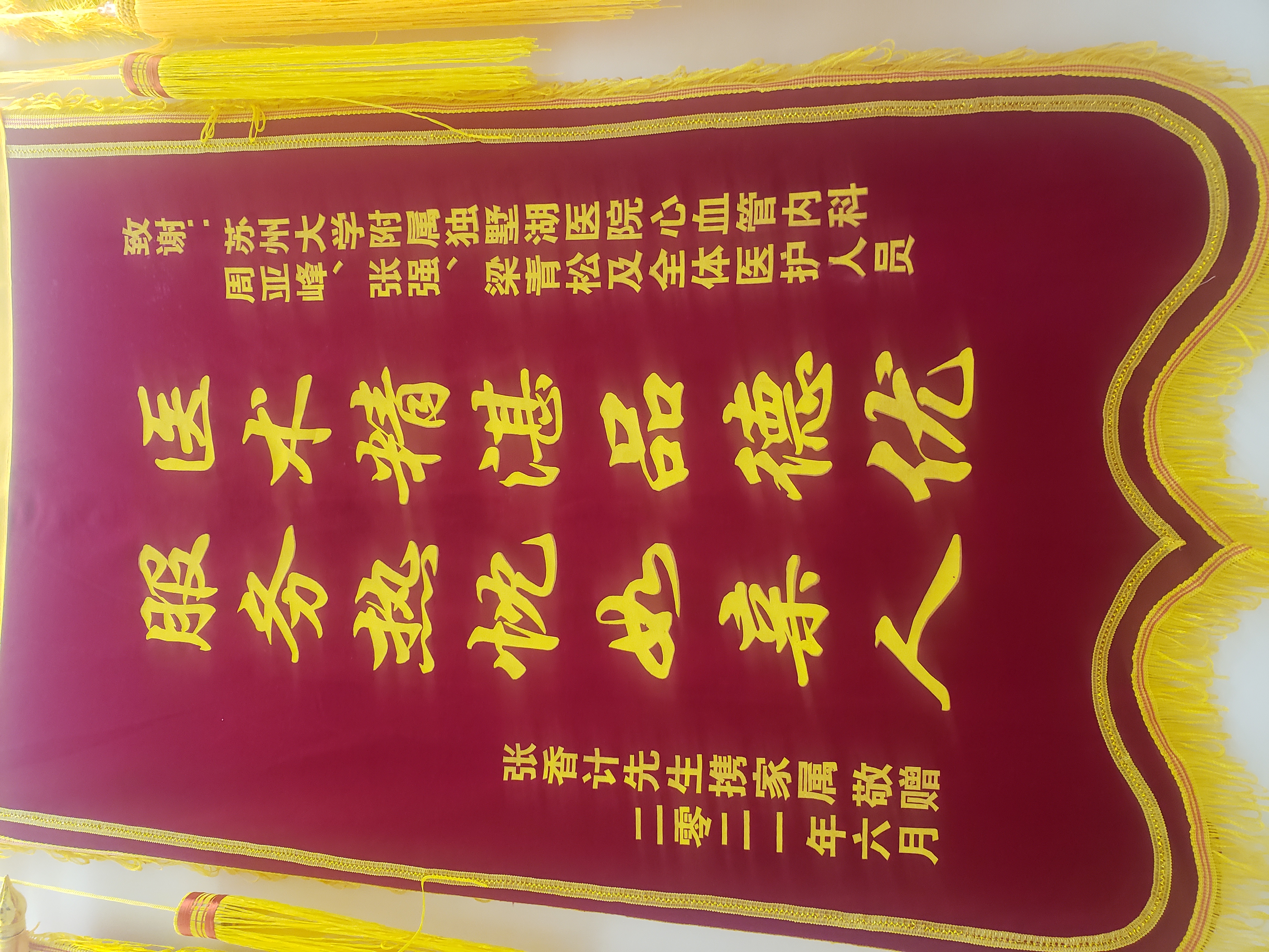 患者张先生赠送锦旗感谢我院周亚峰副院长、心血管内科张强主任医师、梁青松医生及全体医护