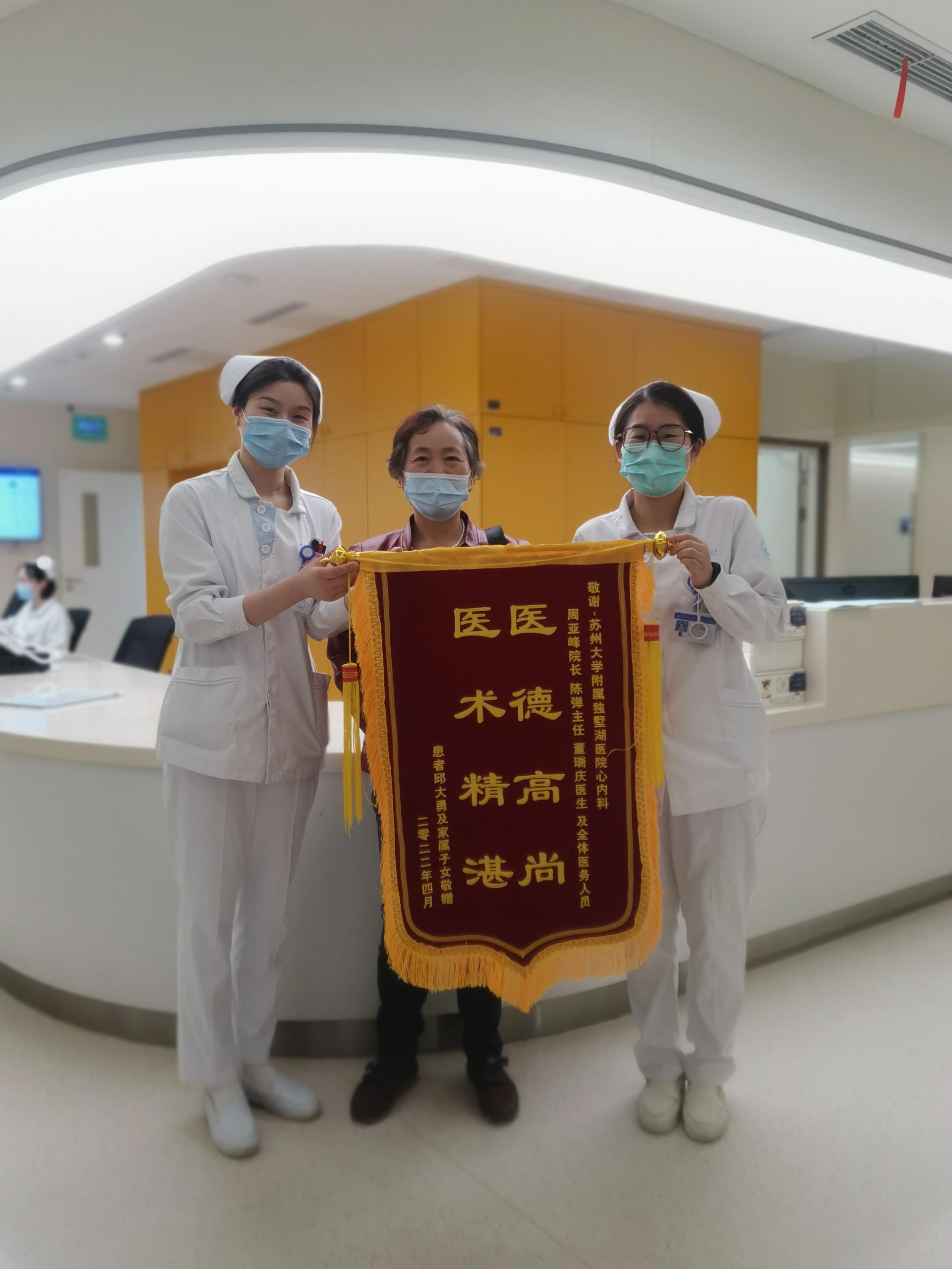 患者邱先生及子女赠送锦旗感谢我院周亚峰副院长、心血管内科陈弹主任医师、董瑞庆医生及全体医务人员