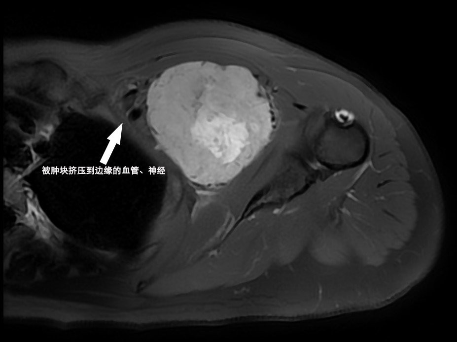 近日,我院血管外科与介入科完成一例侵犯左锁骨下血管及臂丛神经的罕见肿瘤切除。家住园区的王女士最近感觉左臂时常有麻木感,遂到我院就诊。接诊医师发现王女士左肩部前方明显隆起“疙瘩”,于是建议其做了左肩部的MRI检查。结果出来后,接诊医师惊讶地发现在她的左锁骨深面胸壁上有一个“鸭梨”大的肿块,肿块将左锁骨下血管、臂丛神经等紧密粘连在一起,这正是王女士时常感到手臂麻木的原因。
