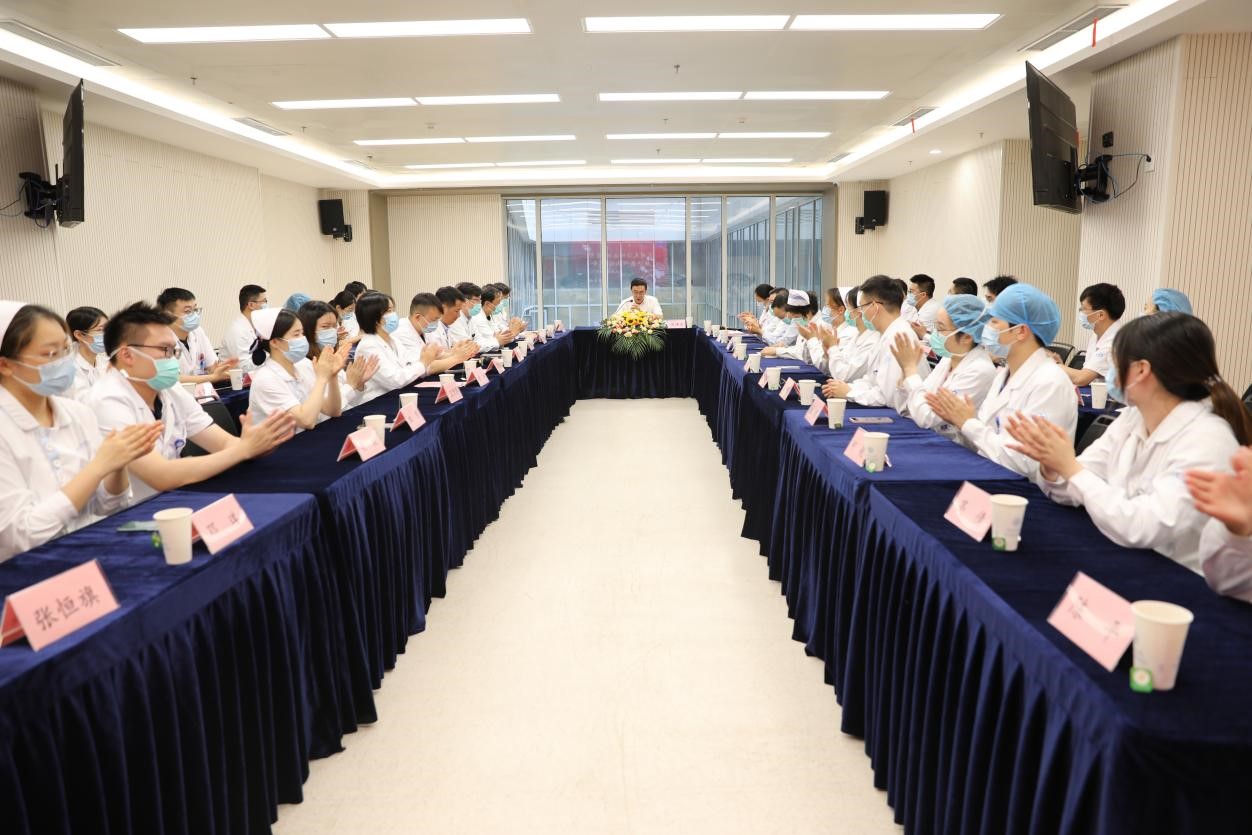 疫情发生以来,独墅湖医院30名医护人员坚决响应上级号召,不负嘱托、不辱使命,经过41天的全力奋战,出色完成了支援上海疫情防控的任务,平安返院。座谈会上,援沪医疗队队长袁欣羽护士长、生殖医学中心黄杰医生及DSA护士郭奖励两位代表作交流发言,他们动情地讲述了援沪期间的工作感悟和心得体会,并对侯院长及全体院领导一直以来的关心关怀表示感谢。