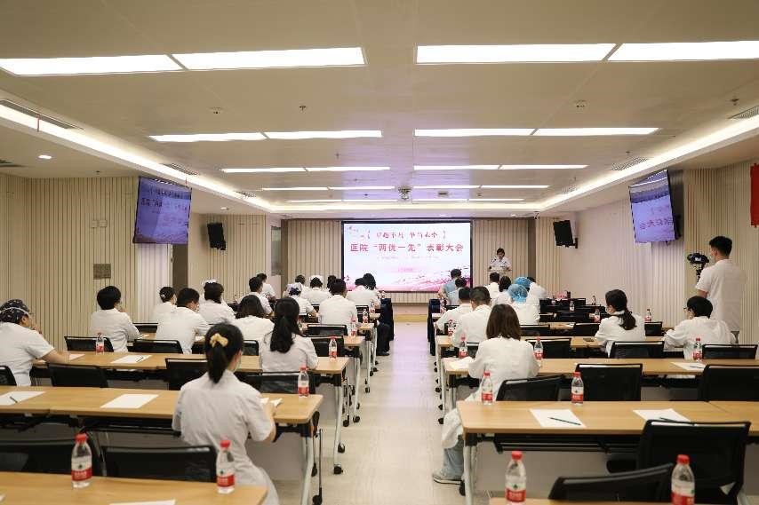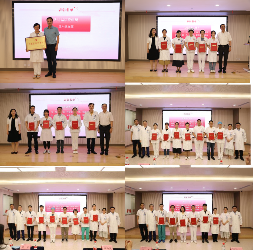 洪建娣副书记宣读医院党委表彰先进基层党组织(1个)、优秀共产党员(21名)、优秀党务工作者(10名)的决定。在表彰环节,钱福良书记、姚青副局长、医院领导为获奖集体和个人颁发奖牌和荣誉证书。