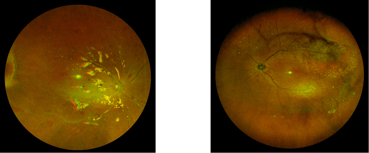 为稳定病患身体状况,安全顺利进行眼科手术,我院普外科先对陈阿姨进行了肝脓肿持续引流,因肝脓肿引流液培养为肺炎克雷伯菌,故立即对陈阿姨目前的感染情况进行了对症治疗。张晓峰主任观察陈阿姨全身情况见稳定,当天下午即转入眼科继续治疗。张主任对患者进行专科检查后发现陈女士右眼仅有不确定的光感视力,右眼球前部约有1mm积脓,瞳仁处也有渗出的厚重膜状物,晶状体混浊,用专业设备也难以观察到眼球后部。双眼B超和眼底检查后诊断为双眼内源性眼内炎(肝脓肿性)。此类疾病并不多见,翻阅文献也仅有几篇类似病例报道。
