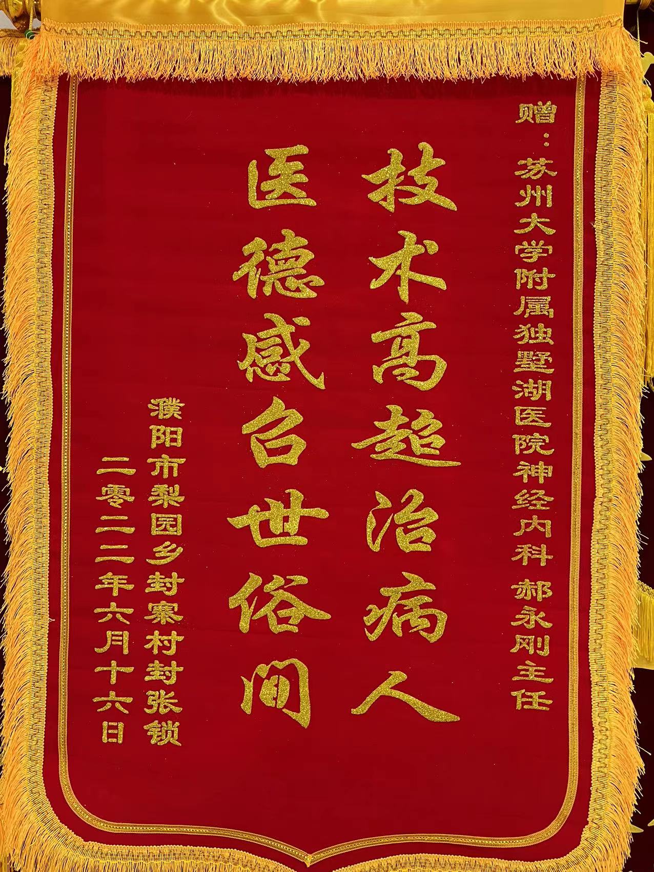 患者张先生赠送锦旗感谢我院神经内科郝永岗副主任