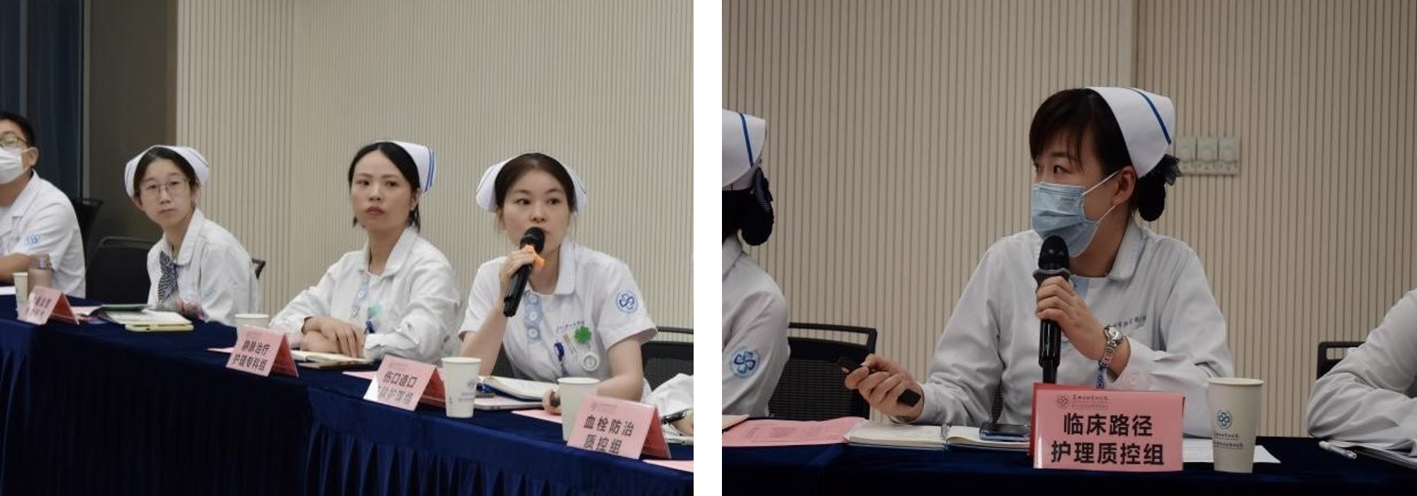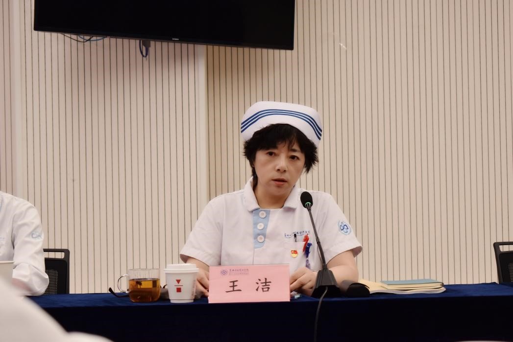 王洁主任围绕2022年上半年度护理质量与安全现状,从护理质量控制与管理、护理质量指标监测、持续质量改进项目、不良事件管理四方面进行分析和总结,指出上半年度工作中的不足,提出整改意见和建议,同时对下一步护理部质控工作重点进行了部署。她强调,各质控组、专科组要进一步提升护理质量意识和风险防范意识,常态化开展护理质控及优质护理服务工作,完善细节及流程;培养创新意识,发挥专科护士领头作用。