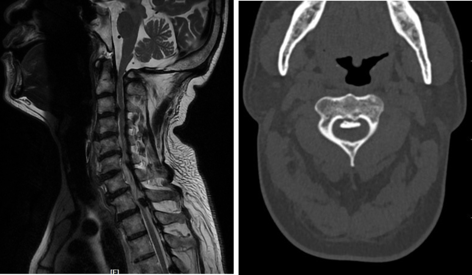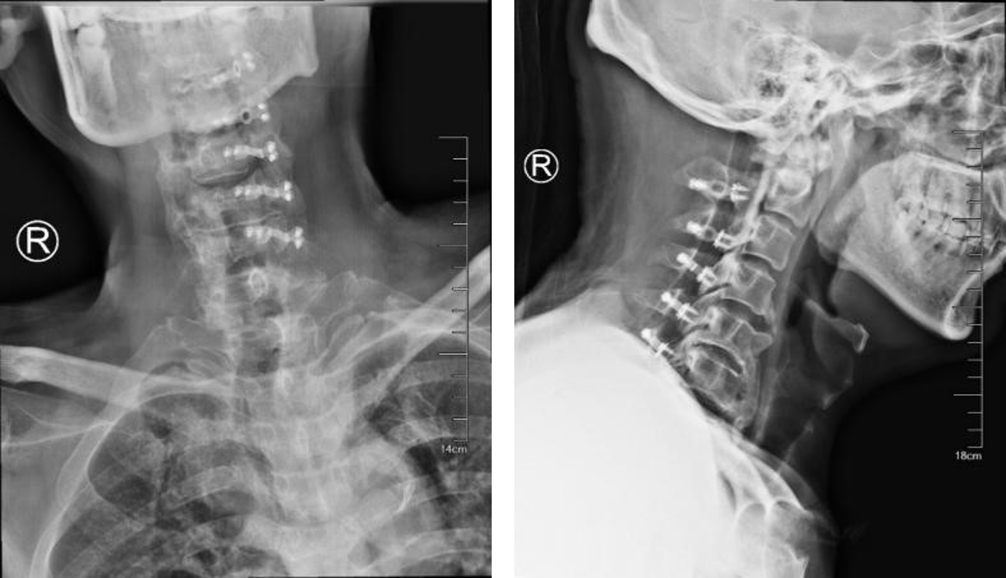 家住镇江的王先生近年来感觉自己的身体出了点问题,一开始是左脚小脚趾有点麻木,后来情况加剧,左手左脚都出现麻木的感觉,走起路来感觉像踩着棉花,这严重影响了他的生活。到当地医院一查颈椎磁共振,提示颈髓严重受压,在他的CT上看到压迫神经的主要是异常增生的骨赘(后纵韧带骨化)压迫了第1~6(下称C1~6)颈髓(第1~2颈椎由于解剖结构特别复杂,在医学上称为上颈椎)。上颈椎压迫脊髓可引起四肢麻木无力、呼吸循环功能障碍等,严重者甚至危及生命。王先生这种情况非常危险,颈髓已严重受压,就好像脖子上背了一个小炸弹,一旦他不小心摔跤,就很有可能危及生命。