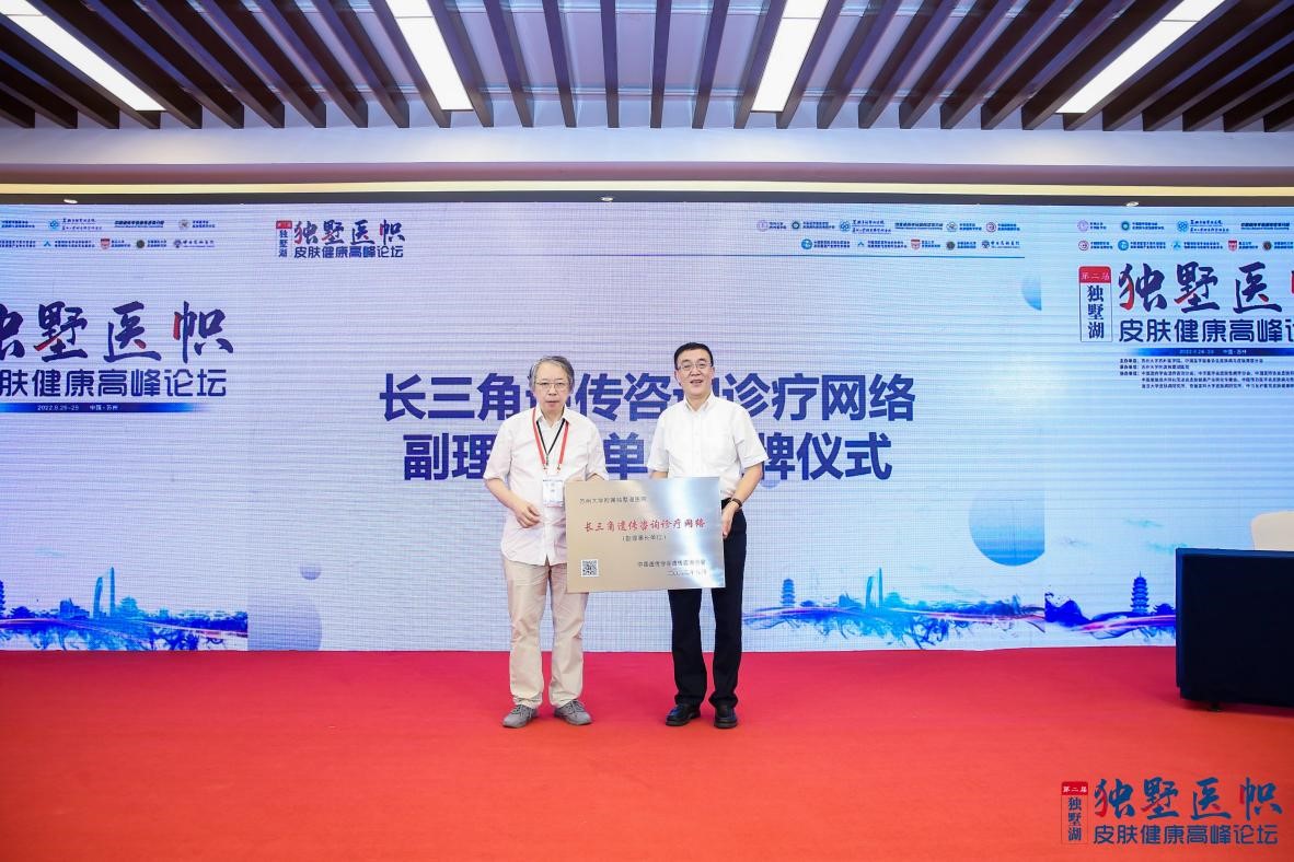 随后,贺林院士为苏州大学附属独墅湖医院授予“长三角遗传咨询诊疗网络副理事长单位”。贺林院士表示,遗传咨询对于人类基因组信息的破解有重要意义,希望通过此次授牌并积极开展后续工作,提升区域的遗传咨询水平。要通过同时抓牢攻克罕见和非罕见皮肤病的手段来实现对皮肤疾病的大清扫。侯建全院长表示,独墅湖医院十分荣幸成为“长三角遗传咨询诊疗网络”副理事长单位,医院将利用自身优势,建设创新技术先行先试示范中心,构建结构布局合理、技术特色明显的优势学科群,为人民群众的健康提供高水平高质量的医疗服务。