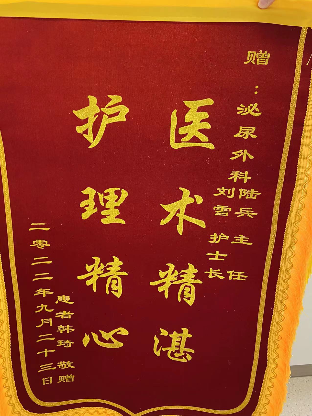 患者韩先生赠送锦旗感谢我院泌尿外科陆兵副主任医师及刘雪护士长