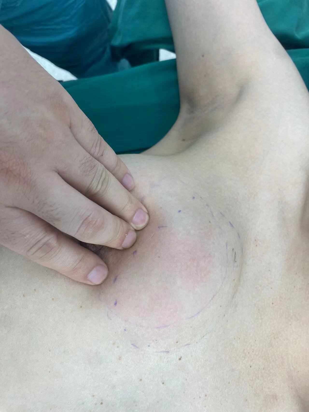 张主任另辟蹊径,决定对她实施经外侧腋窝切口的腔镜辅助下的乳房肿块切除术,以最大程度缩小创口,这样既避免了巨大手术切口的丑陋,又实现了乳房大肿瘤的完整切除。