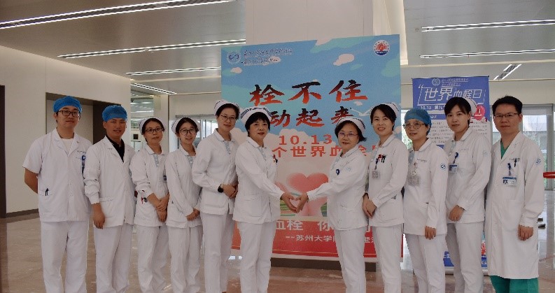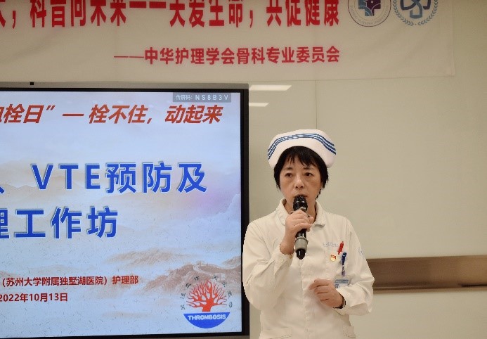 2014年3月,国际血栓与止血学会(ISTH)宣布将鲁道夫·菲尔绍的生日(10月13日)作为“世界血栓日”,以纪念他首先提出“血栓形成理论”。临床上,血栓栓塞性疾病常见、多发,危害大,被称为“沉寂的杀手”。为了进一步弘扬以全民健康为中心的理念,倡导科学健康的生活方式,强化护理人员风险防范意识,提高护理人员VTE 防控专业知识和规范预防率,2022年 10月13日,苏州大学附属独墅湖医院护理部成功举办“世界血栓日”主题活动——VTE 物理预防实践。本次活动由中华护理学会骨科护理专业委员会副主任委员、苏州大学附属独墅湖医院护理部王洁主任主持并进行倡导发言,点明血栓日活动主题“栓不住,动起来”的由来和意义,强调了VTE物理预防在临床护理实践工作中的重要性。