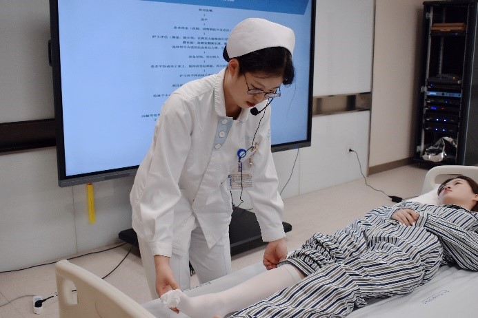 实战环节,由骨科护理团队国家级专科护士朱东方等借助临床案例详细演示间歇性充气加压装置(IPC)和梯度弹力袜(GCS)的规范使用流程,进行了标准化的操作流程示范,促进了临床VTE物理预防护理工作的同质化和标准化,参会人员反响热烈,感慨受益颇多,进一步巩固了VTE的规范预防。
