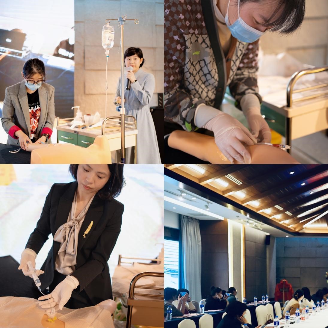 随后,苏州大学附属独墅湖医院静疗专科团队通过图片展示、现场演示等形式鼓励大家共同纠错,对当前发生频次较多的不规范现象进行讨论。最后由静疗专科团队演示PICC、输液港、外周浅静脉留置针的规范化操作,再次强化静脉治疗相关流程。